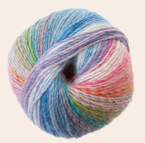 Sirdar's Jewelspun Chunky With Wool is a cozy, self-striping, lightweight, machine-washable wool blend. The stripes appear as you knit, in the direction of your rows, and will appear narrower in a circular knit than in a pieced design. Sirdar Jewelspun With Wool has incredible meterage too; you can make a cosy hat and generous co-ordinating snood with just one ball.