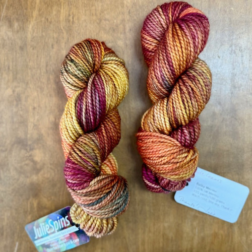 Julie loves to work with color, and the textures of yarn and fiber never cease to fascinate her. Much of her dyeing is spontaneous but as she work with the colors and the contrasts, usually an idea starts to form, and she keeps applying colors until the "canvas" says what she wants it to. Because she is also a spinner, she has a reasonable (alas not infallible) sense of what hery "paintings" will look like when they are turned into yarn. She tries to use the highest quality fibers because that's what she herself enjoys spinning, and life is too short to work with inferior products. She hopes you love her beautiful yarns! Dyed in Boston, MA